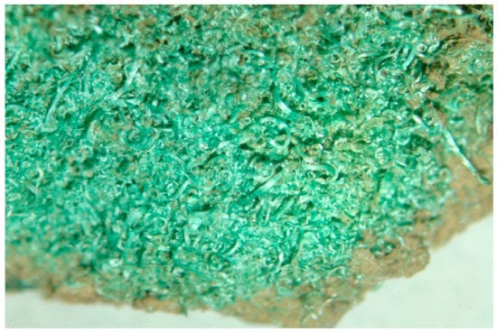 - Nienhuis, J.; Robbiola, L.; Giuliani, R.; Joosten, I.; Huisman, H.; van Os, B.; Sietsma, J. Curly malachite on archaeological bronze: A systematic study of the shape and phenomenological approach of its formation mechanism. e-PreservationScience 2016, 13, 23–32. [Google Scholar]