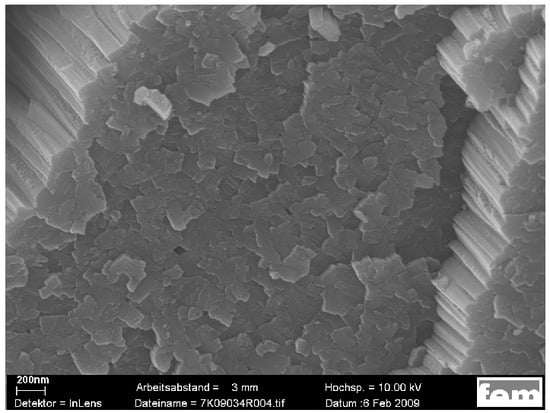 We could confirm the identification as malachite by qualitative spot tests, XRPD, and Fourier Transform Infrared Spectroscopy (FTIR). The curls seem to contain a little zinc (mostly close to the detection limit). They occurred on brass, bronze, and copper-containing silver alloy objects and there are reports of Bronze Age finds. Whilst most of the curls formed only part of a circle (radius some tenth of a mm), some looked similar to a corkscrew (helix), and others similar to a clock spring, under the microscope (Figure 5). In the electron microscope, no structure of any organic material, to be expected for negative or positive casts of them in corrosion products (‘pseudomorphs’), could be detected. A Field Emission-Scanning Electron Microscope (FE-SEM) image (Figure 6) of a curl cross section shows that the individual fibres of a sub-µm diameter are polygonal, as to be expected with minerals. An intensive search in the mineralogical literature brought some curl reports from mines to light, excluding any human involvement in their growth [19]. Giving no clue to the age or to alloys, even to human involvement at all, the malachite curls are somewhat disappointing as an historic information source.