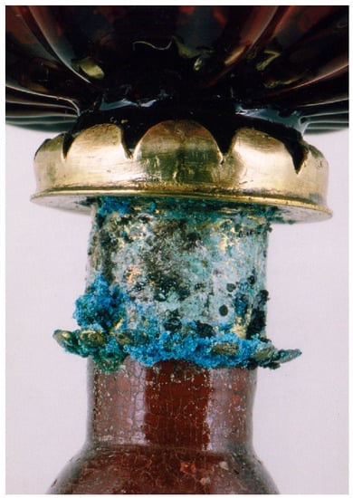- Eggert, G.; Wollman, A.; Schwahn, B.; Hustedt-Martens, E.; Barbier, B.; Euler, H. When glass and metal corrode together. In Proceedings of the ICOM Committee for Conservation 15th Triennial Meeting, New Delhi, India, 22–26 September 2008; Bridgland, J., Ed.; Allied Publisher: New Delhi, India, 2008; pp. 211–216. Available online: https://icom-cc-publications-online.org/1846 (accessed on 3 January 2023).