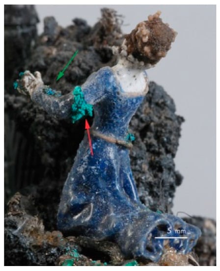 - Eggert, G. Pseudomorph or corrosion? The enigma of the curly malachite. In When Archaeometry and Conservation Meet, Proceedings of the Metal 07: Interim meeting of the ICOM-CC Metal WG, Amsterdam, The Netherlands, 17–21 September 2007; Degrigny, C., van Langh, R., Joosten, I., Ankersmit, B., Eds.; Rijksmuseum: Amsterdam, The Netherlands, 2007; Volume 1, pp. 57–60. [Google Scholar]