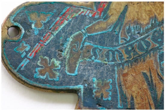 - Holzleitner, M.; Hietz, M.; Lenhart, E.; Anghelone, M.; Krist, G. Glass-Induced Metal Corrosion: Study and Conservation of an Enamelled Altarpiece (1954–1956) of the Collection of the University of Applied Arts Vienna. In Proceedings of the Metals 2019—Interim Meeting of the ICOM-CC Metals Working Group, Neuchâtel, Switzerland, 2–6 September 2019; pp. 365–368. Available online: https://icom-cc-publications-online.org/3519 (accessed on 3 January 2023).