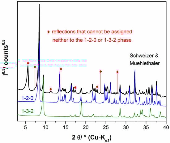 Comparison of the diffraction patterns of the sample denoted as 1-2-0 phase synthesised by Schweizer and Mühlethaler [53] and of a pure 1-2-0 and 1-3-2 phase, synthesised by Bette et al. [55]. ◆ = other unknown phase(s).