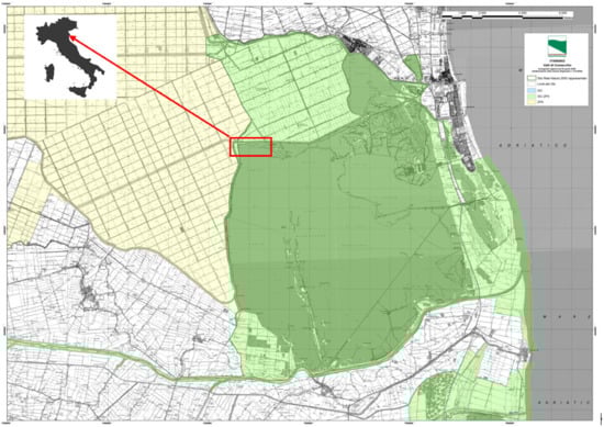 Map of Valli di Comacchio IT4060002—Sito Rete Natura 2000 [12] referring to Italy: in the red rectangle is the investigations area. To the southwest side of the lagoon is the Boscoforte dune, with small emerging islands.