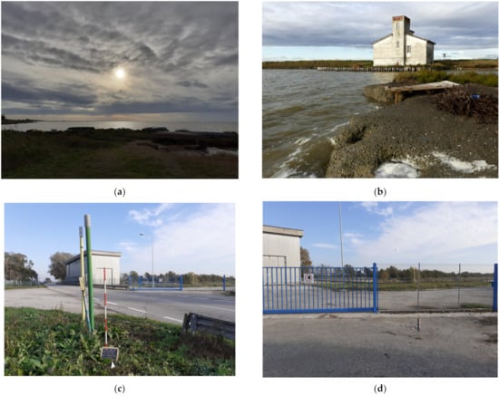 Comacchio (FE), Valle Fossa di Porto c: (a) west–east panorama; (b) east–west panorama with Casone Garibaldi; (c) north limit of the Valle Fossa di Porto: underground pipeline west of road SP 72 (Argine Agosta) and Fosse reclamation station; (d) asphalt square with access to the reclamation station (photo G. Bucci).