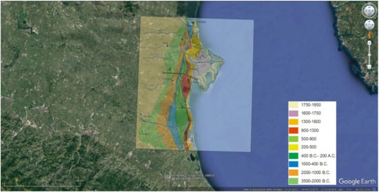 - Bondesan, M.; Bucci, V. Gli antichi cordoni litoranei del settore Sud-occidentale delle valli di Comacchio. In Atti dell’Accademia delle Scienze di Ferrara; XLVIII; Accademia delle Scienze di Ferrara: Ferrara, Italy, 1972; pp. 1–18. [Google Scholar]