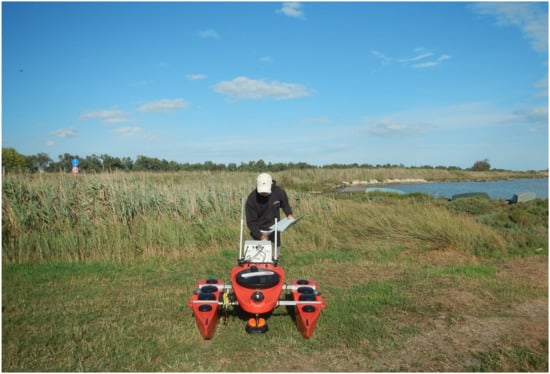 From the point of view of research planning, considering a series of preliminary surveys and checks on the depth of the water, we have found that the most useful means for carrying out remote-sensing investigations would have been a shallow draft hydrographic drone. Among the various autonomous vehicles for non-invasive investigations capable of navigating even in 30 cm-deep water, we choose the OpenSWAP—Shallow Water Autonomous Prospector [10], a small catamaran on which several instruments could be mounted at the same time by concentrating the scan times (see Section 2, Materials and Methods); this means that it is equipped with an echo-side-scan sonar, single-beam, and sub-bottom profiler, which would have allowed us to read the morphology and stratigraphy of the seabed, offering a diachronic complete approach.