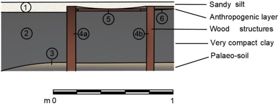 From the stratigraphic point of view, a powerful layer of gray clay (US2), covered by sandy silt (US1), emerges from the sand (US3) up to the water surface (thickness > 50 cm); on this stratum, there are postholes with a diameter of approximately 15 cm, residues of piles (US4a and 4b) fixed together with horizontal beams on the same chronological phase (US5). The fragments of the structure correspond to the shoreline, partially emerged, and are subject to deterioration due to the tides and the slight wave motion generated by local winds (Scirocco). Because of the low rainfall of the years 2020–2021 and the low tide, an anthropogenic layer became visible during our work (Figure 9).