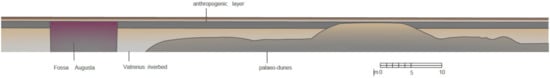 Through the reconstructive section (Figure 12), from west to east, we see the deep palaeo-riverbed with the typical alluvial traces of flooding, above the ancient dunes; the river has been excavated quite in the center, to construct the new waterway, the Fossa Augusta, in the stretch of the river that flowed from south to north; the margins of the cut of the Fossa are vertical and obviously artificial, giving an unequivocal interpretation of an anthropic artifact.