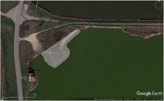 Comacchio (FE), Valle Fossa di Porto Google Earth satellite image: area of the clay plateau with wooden findings and pottery fragments (accessed on 5 October 2021).