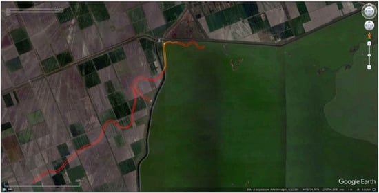 Linking the profiles to the anomalies detectable through satellite photography, we reconstructed the palaeo-watercourse of the Vatrenus, approximately for a length of 5 km, confirming the first hypotheses formulated by Veggiani [31,32,33,34] who recognized the ancient Vatrenus as a river diversion of the Santerno, running from south to north, close to the Agosta bank, corresponding actually to the provincial road SP72 (Figure 17).