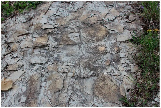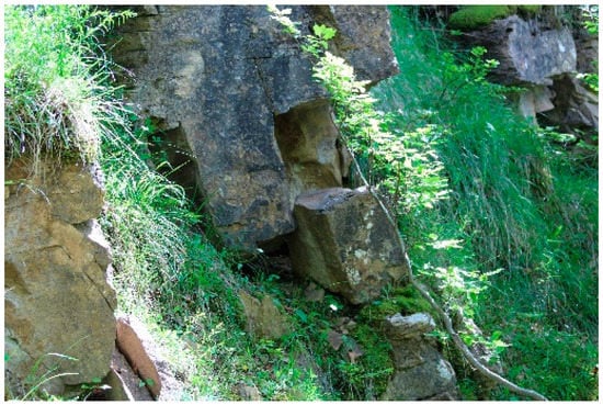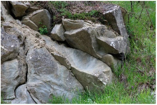 Most of the masonry analysed were determined to be made up of lithic elements of local sandstone bonded with raw earth. Based on the masonry cataloguing criteria included in the AeDES forms, the wall textures fall within the case study defined as “irregular and of bad quality”. This does not mean that the walls are completely chaotic, but they are not made up of regular elements arranged in perfectly horizontal rows. In fact, in almost all of the buildings with exposed masonry, the stone elements have little to no work performed at all, presenting uneven dimensions. However, there is a good attention to the arrangement of the stone elements in order to respect some horizontal line of the rows. This construction technique has certainly developed as a result of making the most of the territorial resources and natural conditions of the available materials [10]. In fact, the fracture planes of the local sandstone, which emerge in benches throughout the territory, indicate that this type of stone tends to naturally detach in blocks of rather regular shape (Figure 5 and Figure 6).