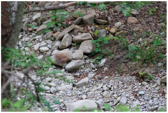 The alignments of the rows were also managed using another material available in the area, namely flysch. Flysch is a deposit of marly sandstone that detaches very easily from the substrate in the form of very regular plates with parallel and orthogonal breaking planes according to their typical laminar structure (Figure 8). This lithotype was used in the masonry to regularize the wall equipment by creating horizontal support surfaces for the sandstone blocks. However, there is no lack of more irregular stone elements with a rounded shape. The territory is in fact characterized by a complex network of water resources, mostly in a torrential regime, whose action transforms the arenaceous lithotype into a pebble formation (Figure 9). The use of pebbles was found in the upper parts of the walls and inside the wall cores as filling. The latter data were recorded by analysing the wall sections that were made inspectable due to the numerous collapses; the walls are almost always made up of two similar vestments and a core filled with flakes of stone, pebbles and raw earth. In all of the cases analysed, the presence of connecting headers between the wall leaves was recorded (Figure 10). The walls were covered with protective layers of plaster. In fact, in many of the buildings with exposed or partially exposed masonry, remains of thin plaster were found. (Figure 11). From the visual analysis, the plaster appeared to be created from lime. The diagnostic investigations have thus confirmed the use of lime as a binder.