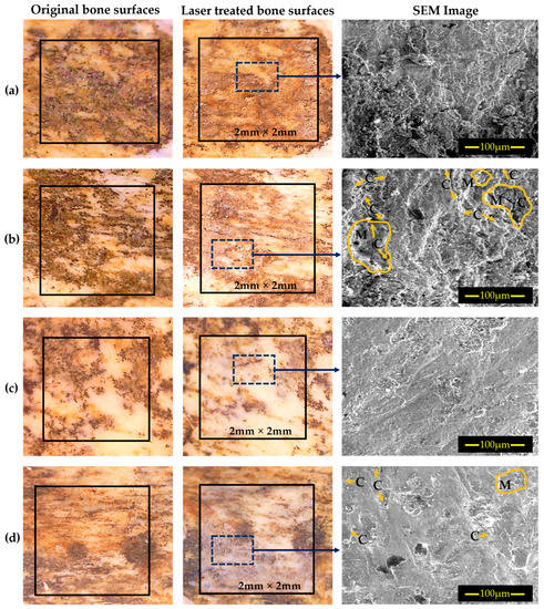 Optical microscopy images of the original bone region (left), laser beam scan mode treated bone region (middle), and corresponding SEM images of the laser cleaned area. (a,b) presents the sub-ns n-IR laser treatment while (c,d) shows the outcomes of sub-ns UV laser treatment. Evidence of cracks and melting is indicated by yellow arrows and represented by letters ‘C’ and ‘M’ accordingly.