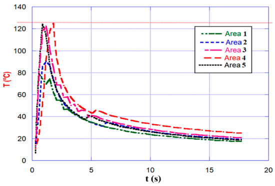 When the laser irradiance level is increased, the average bone surface temperature rises. Quantification of accumulated heat was considered important mainly when irradiating the bone surface with the n-IR wavelength, as heating did not appear so relevant in the case of UV laser irradiation. Nonetheless, a comparative study between the three laser emissions reported here is presently underway. Figure 3 thus depicts the average temperature increase due to the heat accumulated when the bone surface is irradiated with an 800 ps n-IR laser. Using the processing parameters listed in Table 2, it takes roughly 1.5 s to treat an area of 2 mm2 of the bone surface just once. IR thermal camera’s measuring range of −40 °C to 125 °C is exceeded by the maximum temperature for 0.45 GWcm−2 irradiance values (Figure 3: Area 4). At a temperature of more than 125 °C, melt and cracks on the bone surface started to appear. It was observed, however, that irradiation parameters in the vicinity of the cleaning threshold induce a temperature rise to a maximum value of ≈123 °C, while the ablation threshold can induce maximum temperatures approaching 75 °C (Figure 3: Area 1).