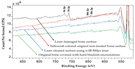 To assess the chemical composition of the bone surface, specifically the hard blackish over-layers and blackish-yellowish stains in both, as received and laser-treated surfaces, XPS data (Figure 4) were analyzed to detect the presence of Mn and Fe, besides the other expected elements associated with bone and soil. XPS revealed the sample’s surface and vicinity contained Mn, which could have originated not just during mineralization, but also from within the initial bone [5]. Fe and Mn, which are known to display dark stains are also responsible for the black hue seen in the latter [5]. Both characterization methods indicate that Mn and Fe are still present in appreciable amounts within the 0.45 GWcm−2 sub-ns n-IR laser irradiated area (Table 2: Area 5). If bone has, in addition, been submerged for an extended length of time and mechanical breakdown or chemical degradation has occurred, Mn and Fe compounds might precipitate to a depth observable in the bone cross-section near the surface. This could result in blackish-yellowish stains and later encrustations on the bone’s topmost layer (Figure 2 and Figure 4).