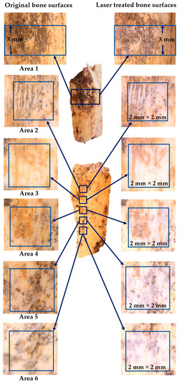 According to this study, damage on the bone surface can be avoided at irradiation intensities below 2.37 TWcm−2. Additionally, these data indicated that irradiation at 2.79 TWcm−2 produced damage to the substrate’s surface, where cracks and melts were evident (Figure 6, Area 6). Irradiance levels at or below 2.37 TWcm−2 were thus chosen for further bone laser cleaning experiments, since they appeared to cause no detrimental effect on the bone surface. Following multiple irradiation tests, it was determined that the cleaning efficiency was satisfactory for removing the hard black encrustations and blackish-yellowish staining. By deliberately raising the number of laser beam scan repetitions in cross-scan mode while maintaining the same laser and beam scan parameters, the original appearance of the bone surface was gradually revealed without apparent damage.