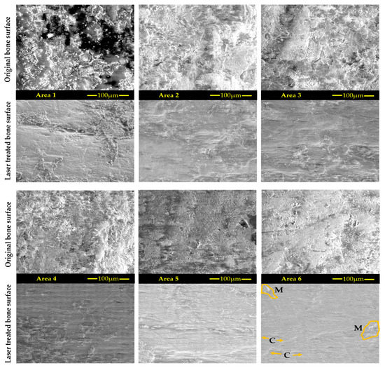 SEM images obtained on the Pleistocene untreated and ‘laser-treated’ bone surfaces subjected to this study. Columns 1 and 3 correspond to areas 1–6, (associated with the left side in Figure 5). Equivalent micrographs are shown in columns 2 and 4, corresponding to laser-treated areas 1–6 (associated with the right side in Figure 5). The letters “C” and “M” in Area 6 denote crack (yellow arrows) and melt (yellow areas) evidence, respectively.