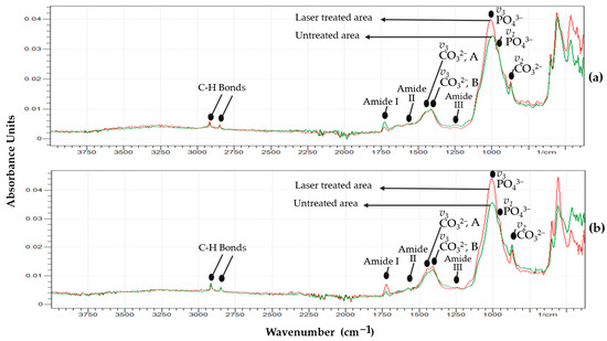Figure 7 depicts the ATR-FTIR spectra of a Pleistocene bear bone in its original excavated condition as well as after it was treated with an fs laser with average irradiances of 1.24 TWcm−2 (Figure 7a) and 2.37 TWcm−2 (Figure 7b), respectively. Spectra obtained from treated samples are more indicative of the organic content present within the bone surface, whereas spectra obtained from untreated samples have a lower signal-to-noise ratio. This difference is attributable to the removal of contaminants by the laser, rather than to differences in the bone surface condition.