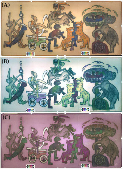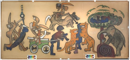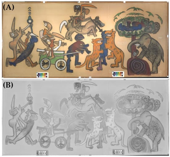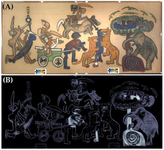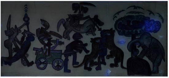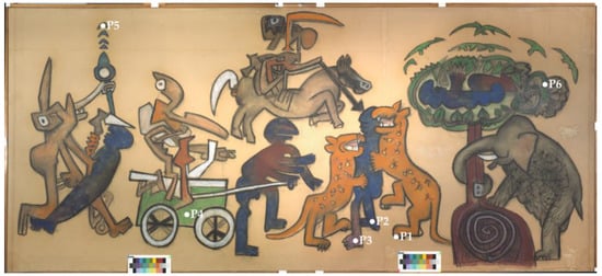 The Chilean artist Roberto Sebastian Matta (1911, Santiago, Chile–2002, Civitavecchia, Italy) is one of the most outstanding personalities of the Surrealist art movement, to which he was introduced by the founder André Breton at the beginning of the 1930s [1,2]. His paintings are exhibited in the world’s most valuable contemporary art collections such as London’s Tate Modern, the Metropolitan (MET) and Museum of Modern Art (MoMA) in New York, the Art Institute of Chicago and Centre Pompidou in Paris [3,4]. In his latest works, in a phase of overcoming Surrealism, Matta devotes himself to the pastel technique and to his desire to expose current events and turn to man’s actions by denouncing their cruelty, voracity and “bestial imbecility” [5]. To this artistic moment and inspiration belongs the triptych Perchè le vittime vincano (For the victims to win) (1974–1975) made up of three separate large paper sheets lined on canvas, two smaller lateral ones (179.1 × 150.6 cm) and a central one (180.3 × 405.1 cm), this last being the object of the present paper. The paintings settle in the great cycles of pastel artworks that Matta realized in Tarquinia (central Italy). In this artwork, Matta recalls figures of ancient codes of the Mayan, Azteche and Araucana peoples brutally subdued by Spanish conquerors and the violence of the military coup which in 1973 dismissed Salvador Allende from the legit democratic leadership of Chile. According to the sources [6], in 1975, the triptych was donated to the municipality of Tarquinia by Roberto Sebastian Matta as a sign of thankfulness for the received honorary citizenship and it was exhibited in the Hall of the Council of the town hall of Tarquinia since the moment of its donation. The central panel (Figure 1) was investigated with both spectroscopic methods and innovative diagnostic imaging techniques in order to understand its creative process, characterize painting materials and evaluate the state of conservation of the painting.