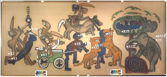 X-ray Fluorescence spectra were collected with a portable XRF spectrometer (Surface Monitor II, Assing, Rome, Italy). The instrument is based on a silver anode as the excitation source and detector X-123 Si Pin that allows the detection of elements from atomic number 16 (S) to 92 (U) with an energy resolution of 146 eV. The X-ray beam is collimated to a spot diameter of about 2.0 mm in diameter. For all measurements on the painting, the following experimental conditions were employed: tube voltage 40 kV; tube anode current 76 μA, acquisition time 60 s. XRF measurements were performed in a total of 18 points (X1–X18) on all the different color pastels used in the work, also including 3 points of the paper support as a reference and to explore the possibility of possible dyeing of the paper (Figure 2).