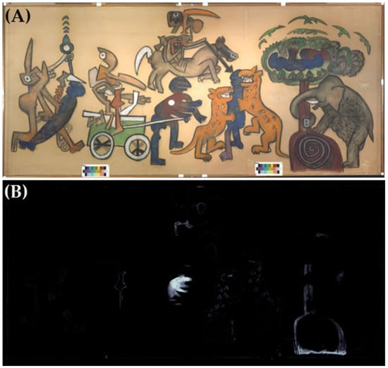 To better highlight the black outlines of the figures and objects in the scene, the NDI (normalized difference index) algorithm was applied to the calibrated bands. In particular, the UV and RGB bands were subtracted from the three IR ones. In Figure 7 the image resulting from the application of the NDI algorithm is displayed clearly showing the outlines of the figures and objects in the scene.