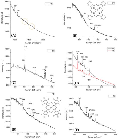 - Point 4 (P4) and 5 (P5): light-green and light-blue pastels. Raman spectra revealed that the two colors are very similar chemical compounds (Figure 9D,E). In particular, P4 shows most of the main peaks and the group of signals at 1088, 1208 and 1280 cm−1 that indicate the presence of Cu-polychloride-phthalocyanine, but other Raman shift of the peaks at 664, 744, 1088, 1208, 1329 and 1535 cm−1 suggest a mixture with Cu-Phtalocyanine Green, called Monastral Green. P5 presents Raman peaks clearly comparable to the IRUG spectrum of Cu-polychloride-phthalocyanine.