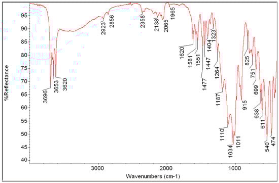 FTIR analysis supplied the identification of original painting materials. The investigated sample was picked by one of the Rembrandt soft pastels still preserved in Matta’s studio in Tarquinia. This was a unique and invaluable opportunity to compare the artwork’s materials with original contemporary art products of the 20th century perfectly preserved and it also represented helpful support for heritage sciences in this study since the fragility of the pastel painting and the actual risk of pictorial fall and loss strictly limited the number of samples available for analytic surveys. As shown in Figure 10, the FTIR spectrum is complex and rich in signals attributable to both inorganic and organic compounds. The presence of sharp peaks in the spectral range 3696–3200 cm−1 can be associated with -OH stretching which is present in clay materials, such as kaolinite and bole. Further signals attributable to kaolinite/bole can be observed at 1110, 1034, 1011 and 915 cm−1, while the peaks at 540 and 474 cm−1 indicate the presence of iron oxides. Aromatic overtones in the 2138–1965 cm−1 range can be associated with an organic dye of the anthraquinone group, together with signatures between 1323 cm−1 and 1620 cm−1. The IR spectrum does not show the presence of signals referable to binders such as wax or oil that would have shown very strong -CH signals in the 2850–2950 cm−1 spectral range while the ones of the pastel sample’s spectrum are very weak at 2923 and 2856 cm−1. Thus, FTIR attested the use of pastels with high quantities of kaolin and bole and without any wax or oil binders.