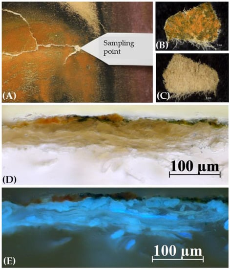 Micro-sample of Matta’s painting in correspondence of a small tear in the pictorial layer (A); front (B) and back (C) sides of the sample; optical microscope photography of the sample in cross-section at 100× magnification in reflected light (D) and under UV radiation (E).