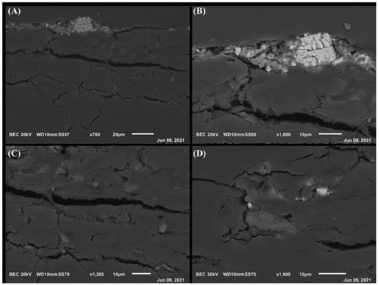 SEM images in backscattered electrons: (A) view of the examined area at 750× magnification; (B) detail of heavier elements (whiter area) at the surface of the section at 1600×; (C) internal area of the section in the proximity of a crack, 1300×; (D) lighter agglomerates, 1900×.