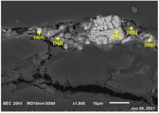 Some white and grey agglomerates are visible within the section close to longitudinal cracks of the paper and close to the pictorial layer (Figure 12C,D). Micro EDS analyses were performed on 5 points relating to BSE images of Figure 12B and reported in Figure 13 (the numbering of the measurement points starts from 002 because of the SEM-EDS software settings).