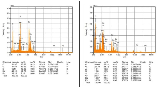 As it can be seen in the EDS spectra reported for points 002 and 003 in Figure 14 (the spectra of points 004, 005 and 006 in Figure 13 are collected in Supplementary Materials, Figures S1–S3), carbon (C) and oxygen (O) are present in all measurement points as elements of the materials that make up the sample. In the clearest areas of the surface, it is always detected the presence of lead (Pb) and barium (Ba), which is generally present as filler added to contemporary colors in the form of sulphate. This hypothesis can be confirmed by the presence of sulfur (S) which in fact is always detected together with barium. Lead is the element present in the orange pigment of the pictorial layer associated with chromium (Cr) (spectrum 003 in Figure 14). This result confirms that the orange color used by Matta is the chrome orange generally reported in the literature with the formula PbCrO4∙PbO or PbCrO4∙Pb(OH)2 [29,30,36]. Two other elements determined in the surface layer (points 003, 004 and 005) are silicon (Si) and aluminum (Al). These elements can be associated with the pastel that, as shown by FTIR analysis, is constituted by a pigment/dye component and a clayey material such as kaolin, the latter being indeed a silicate containing aluminum.