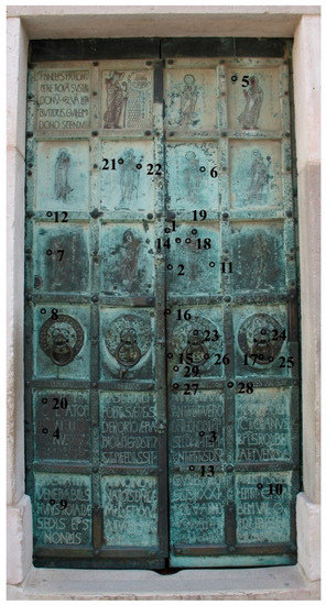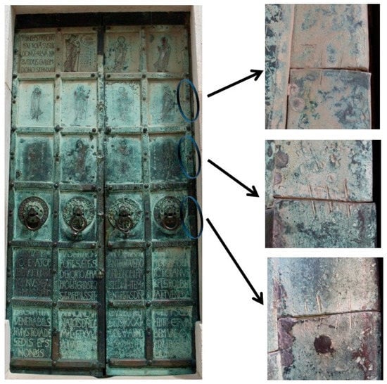 There are currently just about thirty medieval copper alloy doors in Europe that can be visited, and, in particular, in Italy, it is possible to admire them in Amalfi (1060 CE), Monte Cassino (1066 CE), Rome (1070 CE), Monte Sant’Angelo (1076 CE), Atrani (1087 CE), Salerno (1085 CE), Benevento (1150–1151 CE), Canosa di Puglia (1111–1118 CE), Trani (1111–1118 CE), Troia (with two: 1119 CE and 1127 CE), Monreale (1140 CE), and Venice (with two: 1080 CE and 1112 CE) [1,2,3,4,5,6,7,8].