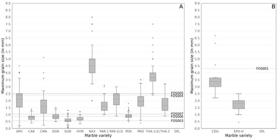 Box plots of maximum grain size (in mm) for the main Mediterranean marble quarries and architectural white marble samples from Forum Sempronii. (A). White marbles (APH: Aphrodisias, CAR: Carrara, DOK: Dokimeion, GOK: Göktepe, HYM: Hymettos, NAX: Naxos, PAR-1: Paros-1, PAR-2(3): Paros-2(3), PEN: Pentelikon, PRO: Proconnesos, THA-1(2): Thasos-1(2), THA-3: Thasos-3, SPL: archaeological samples); (B). Greco scritto-like marbles (CDG: Cap de Garde, EPH-H: Ephesos−Hasançavuslar, SPL: archaeological sample). Quarry data from [30,31,32,34,37,38,39].