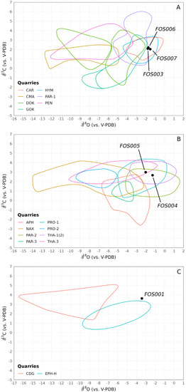 Stable isotope diagrams of the marble samples from Forum Sempronii: (A). White fine-grained marbles (MGS ≤ 2 mm) (CAR: Carrara, DOK: Dokimeion, GOK: Göktepe, HYM: Hymettos, PAR-1: Paros-1, PEN: Pentelikon); (B). White medium- to coarse-grained marbles (MGS > 2 mm) (APH: Aphrodisias, NAX: Naxos, PAR-2: Paros-2, PAR-3: Paros-3, PRO-1: Proconnesos-1, PRO-2: Proconnesos-2, THA-1(2): Thasos−1(2), THA-3: Thasos-3); (C). Greco-scritto-like marbles (CDG: Cap de Garde, EPH-H: Ephesos-Hasançavuslar). Isotopic fields from [30,31,35].