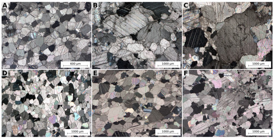 Photomicrographs under crossed polars of thin sections of the marbles samples analysed: (A). FOS003, homeoblastic, polygonal microstructure characterized by triple junctions made of calcite crystals having straight boundary shape (Carrara marble); (B). FOS004 and (C). FOS005, heteroblastic, mortar fabric with calcite crystals showing (mainly) embayed boundary shapes (Proconnesian marble); (D). FOS006, homeoblastic microstructure made of a mosaic of calcite crystals with curved and straight boundary shapes (Carrara marble); (E). FOS007, heteroblastic mosaic fabric displaying calcite crystals with curved boundaries and some plagioclase individuals (Carrara marble); (F). FOS001, heteroblastic mosaic microstructure, weakly foliated, made of strained calcite crystals with embayed ± sutured boundary shapes (greco scritto-like marble from Hasançavuslar).