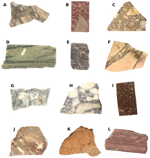 Overview of the polychrome marbles from Forum Sempronii: (A) Africano; (B) Breccia corallina; (C) Breccia di sciro; (D) Cipollino verde; (E) Fior di pesco; (F) Giallo antico; (G) Greco scritto; (H) Pavonazzetto; (I) Porfido rosso; (J) Portasanta; (K) Rosso ammonitico; (L) Rosso antico.
