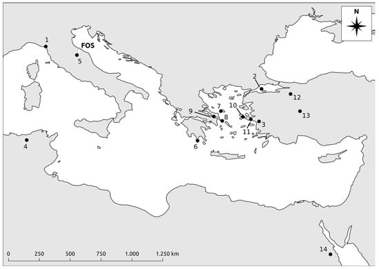 The origin of the polychrome marbles can be traced back to the coast and inland region of Asia Minor, Greece (mainland and Aegean islands), Numidia (Tunisia), and Egypt (Figure 6). The only lithotype of regional origin is rosso ammonitico, a red-to-pink nodular limestone with abundant ammonites and other fossils of Jurassic age that can be traced back to various deposits in the southern Alps, near Verona [43,45,46], and in the central Adriatic Apennines, within the Ammonitico Rosso geological formation of the Umbro-Marchigiana Sedimentary Succession [47,48]. Overall, none of the attested polychrome marbles can be considered atypical for central Adriatic Italy in the Roman Imperial period. Remarkable absences are prestigious varieties of granites. For the latter, we should note the presence of several columns in Troad and Aswan granite currently on display outside the site’s archaeological museum [4]. Even though the exact archaeological provenance of these is unknown, they most likely originate from the Roman town of Forum Sempronii.