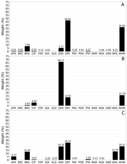 Bar graph of the marbles used for veneer, expressed as percentage of the total weight: (A). Augusteum; (B). Small Baths; (C). Marble depot. Marble abbreviations: AFR: africano; BRC: breccia corallina; BRS: breccia di sciro; CIP: cipollino verde; FDP: fior di pesco; GIA: giallo antico; GLS: greenish limestone; GRS: greco scritto; GRY: grey marble; PAV: pavonazzetto; POR: porfido rosso; PTA: portasanta; RAM: rosso ammonitico; ROA: rosso antico; UND: undefined polychrome marble; WHL: white limestone; WHM: white marble.