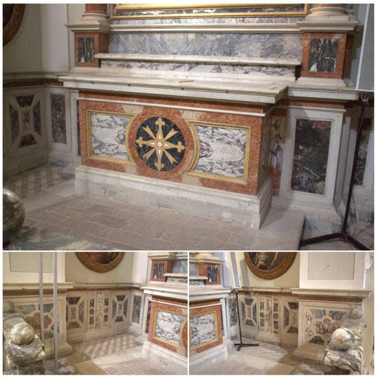 These observations are in line with recent excavation reports and seventeenth-century references that mention the use of a local white limestone pavement for the entrance of the structure and a pavement consisting of large grey and white marble slabs (c. 60 × 90 cm) for the main hall [21,49]. These references further mention a polychrome marble floor for the apsis and polychrome marble plinth (50 cm high) for the walls topped with wall paintings [21]. While the white and grey marble pavement was found largely intact during recent excavations, the polychrome marbles were already stripped in the 17th century. These were partly sold and partly reused in the San Filippo Neri chapel of the Chiesa di San Filippo in nearby Fossombrone [49]. The marble varieties observed here are africano, bardiglio, breccia di sciro, giallo antico, pavonazzetto, portasanta, and rosso ammonitico. These are used at the chapel in combination with presumably post-Roman polychrome marbles, including rosso e verde di Levanto, breccia medicea, and probably giallo mori and cipollino apuano (Figure 8).