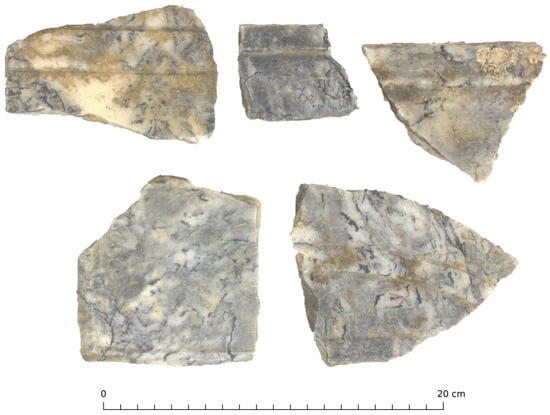 For the marble depot, there is no marble variety that particularly stands out in terms of volume. Grey, white, and greco scritto-like marbles, as well as white limestone and breccia di sciro have been documented in similar volumes (Figure 7). Further, we can note a relatively high quantity of africano, as well as small amounts of polychrome marbles such as cipollino verde, giallo antico, pavonazzetto, portasanta, rosso ammonitico, and rosso antico. Remarkably, greco scritto is encountered here mainly in the form of larger, thin panels with simple moulding decoration along the edges that are part of wall decoration, while white marble and white limestone are part of thicker panels for flooring (Figure 9).