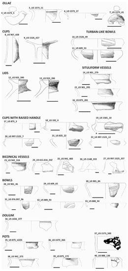 The functional classes are cooking, table, storage and transport wares, both typical and extraneous to the Veneto repertoire. Any pot was wheel thrown [32] and the pottery is represented by the following morphology classes: 2 ollae, 2 cups, 2 turban-like bowls, 2 lids, 3 situliform vessels, 6 cups with raised handles, 5 biconical vessels, 6 bowls, 1 dolium (large container) and 6 pots (Figure 2). Besides the two ollae, two ollae handles were also analyzed. Six potsherds, mainly found within the US 1573, showed very abundant calcareous inclusions. In the present work, the denomination assigned by Ruzzante [32] to the potsherds corresponds with a progressive number—from 1 to 40—(Figure 2), that was used throughout the archaeometry study.