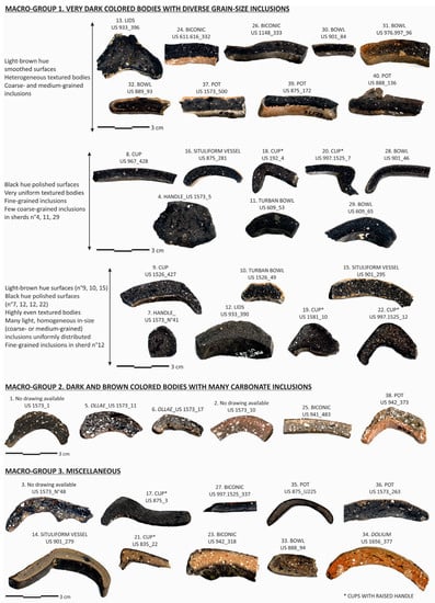 The very dark color of many ceramic bodies may point out the presence of organic matter in the starting raw clays, which induced a reducing environment of firing then preserved while cooling [9,52]. The plentiful inclusions evenly distributed within some sherds of macro-group 1 and sherds of macro-group 2 were probably added (tempered pots). A low porosity is noted, except in n°13 and 40—somehow fissured due to decay processes—and in n°34 and 38, with elongated pores formed during the manufacturing.