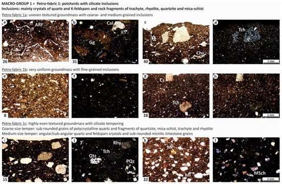 - Local production from the southern Veneto territory (petro-fabric 1, dark-colored ceramic bodies). Common geo-resources were used, consisting in illitic–chloritic clays rich in quartz and alkaline feldspars. Firing regime conditions with a wide range of maximum firing temperatures (always <950 °C) and consistent with pit firing methods were adopted. For the manufacturing of the fine wares, the purification of the raw clays (delicate pieces of petro-fabric 1b) and/or the tempering with silica-rich inclusions (petro-fabric 1c) were accomplished.