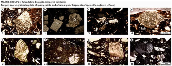 This petro-fabric is characterized by abundant/very abundant (20–40%) carbonate inclusions, especially in sherd n°38 (50%), showing a polymodal grain-sized distribution. These inclusions are chiefly composed of coarse-size crystals of sparry calcite and of sub-angular fragments of speleothems that are even larger than 2 mm in size (Figure 5). Some sparite and micrite limestone fragments and fine-grained quartz crystals (samples n°2 and 25) also occur. The dark-brown hue groundmass is optically inactive (only with slight optical activity in n°25) and likewise shows elongated pores (Figure 5a,e).