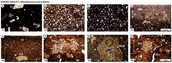 Sherd n°3 displays 10% of inclusions, corresponding chiefly with medium- and coarse-grained crystals of sparry calcite (Figure 6a). Paste n°17 contains very abundant (60%) fine-grained inclusions, very well sorted and with unimodal grain-sized distribution (Figure 6b,c). They are composed of sub-angular quartz crystals and polycrystalline quartz grains and of sub-rounded mica–schist, trachyte, rhyolite and micritic limestone fragments. The micromass of n°35 (with a blurred appearance on the freshly cut surface) is optically active and the inclusions are abundant (40%) and well sorted, mainly corresponding with very fine sorted sand. The groundmass of n°27 is also optically active and the fine-grained inclusions are composed of dominant quartz and phyllosilicate. A few medium-size inclusions (5–10%) also occur, corresponding to micritic limestone grains with irregular shapes associated with clay pellets, Fe-rich grains and grog. As observed in the hand specimen, a slightly lighter area is observed (2 in Figure 6d), but no other specific differences were detected.