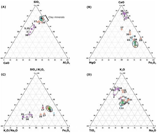 (A–D) Ternary diagrams of some selected oxides or oxide ratios. Calcite-tempered bodies show almost the same degree of clustering (dotted line) while bodies with silicate inclusions were diversely plotted in the various diagrams, many of them rather jointly (continuous line, included within potsherds belonging to petro-fabric 1 and miscellaneous). Petro-fabric 1 (potsherds with silicate inclusions): 1a (black circles), 1b (green circles) and 1c (Si-rich tempering, blue circles); Petro-fabric 2 (purple circles); Miscellaneous (red circles). The dark-colored bodies n°3, 17, 27 and/or 35 are normally plotted very scattered.