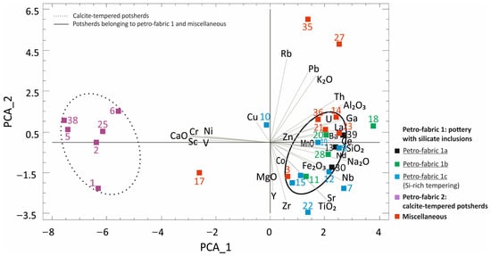 In the score and loading plots of principal component analysis (PCA), bodies with silicate inclusions, belonging both to the petro-fabric 1 and the miscellaneous group, clearly differ from calcite-tempered sherds. Therefore, the last show a higher content of Ca and lower contents of Al, Si, Na and Fe (Figure 8). Some sherds of petro-fabric 1a, almost all belonging to petro-fabric 1c (except sample n°10) and sherd n°3 (miscellaneous) plot at positive values of PC1 and negative of PC2, and they are highly rich both in Si, Na and Fe and Sr, Ti, Zr, Nd and Nb. The bodies n°14, 20, 21, 36 and 39 plot rather jointly at positive values of PC1 and PC2, with high values of Al and Ba as well as of Th, Ga, U and La. According to the loading plots, sample n°10 is rich in Cu, and samples n°27 and 35 are highly rich in K, Rb and Pb.