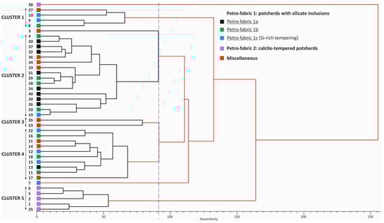 Dendrogram obtained by cluster analysis on XRPD data for the studied potsherds (according to Euclidean distance and average linkage method on position of peaks). The majority of the potsherds belonging to petro-fabric 1 were grouped in clusters 1–4 and almost all the calcite-tempered bodies fall in cluster 5.