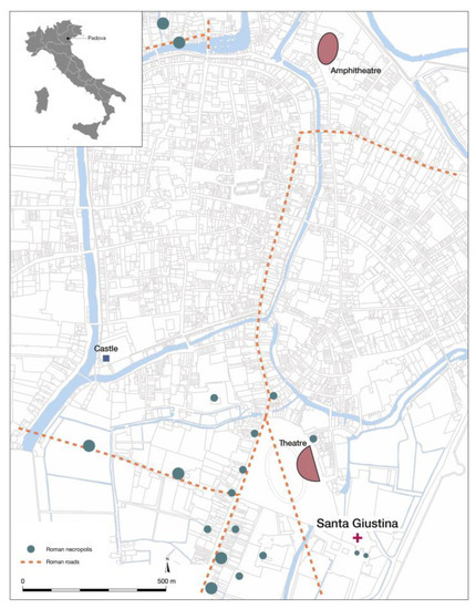 The remains of the basilica of Santa Giustina, which was built in the suburbs of the Roman city of Padova in the 6th century AD and was to become a key ecclesiastical monument throughout the Middle Ages, have been the subject of numerous investigations by historians, art historians, and archaeologists since the 1930s [1,2] (Figure 1). However, many issues still need to be clarified, mainly concerning the archaeological context of its foundation, the function and chronology of the surviving structures, and the plan of the late antique complex. With the aim of answering these questions, the University of Padova has carried out a series of multidisciplinary research projects on this monument to examine the stratigraphic sequence of the architectural remains [3], to re-examine old excavation records [4], and to carry out dating of the ancient mortars [5] and archaeometric characterization of the bricks [6,7].