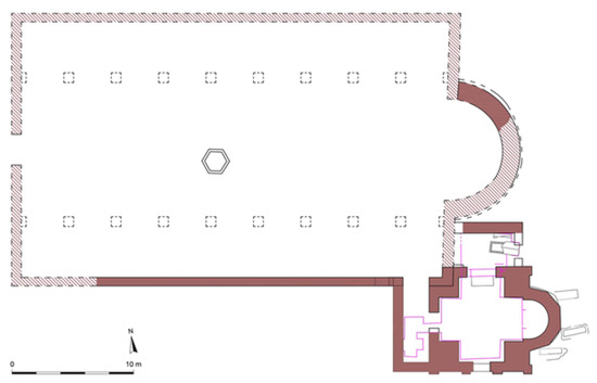 Hypothetical plan of the late antique ecclesiastical complex of Santa Giustina; the red color indicates surviving structures.